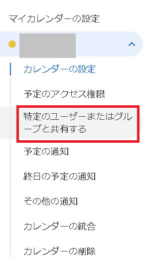 次に設定画面から左側のマイカレンダーの設定から「特定のユーザーまたはグループと共有する」を選んでください。
