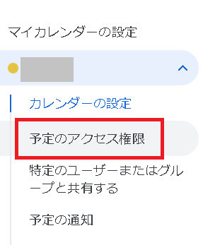 画面左側の「マイカレンダーの設定」を選択し、「予定のアクセス権限」をクリックします。