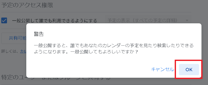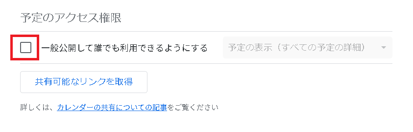 なお、「一般公開して誰でも利用できるようにする」を選択すると、言葉の通りに誰からでも予定が見られるようになるので注意してください。
