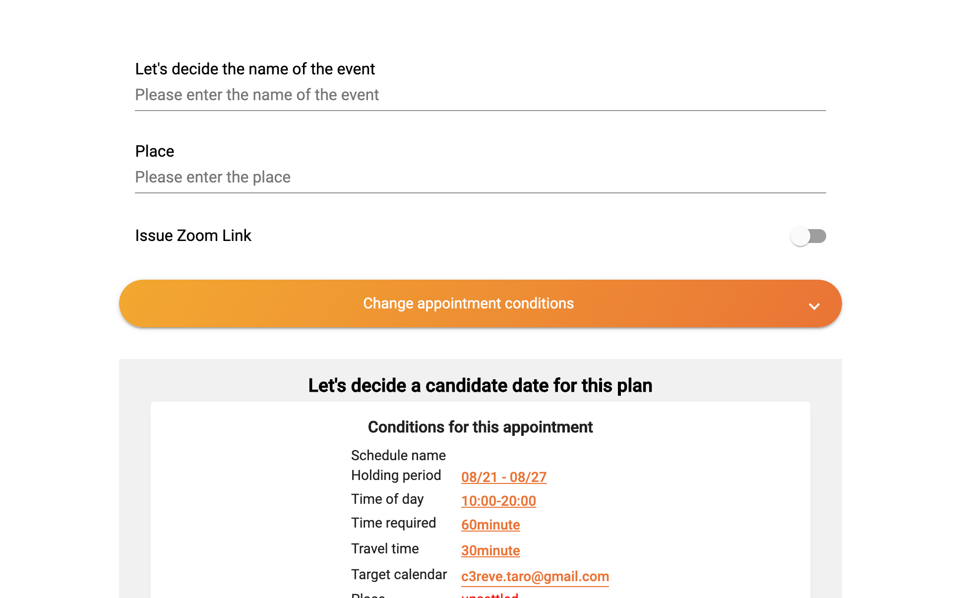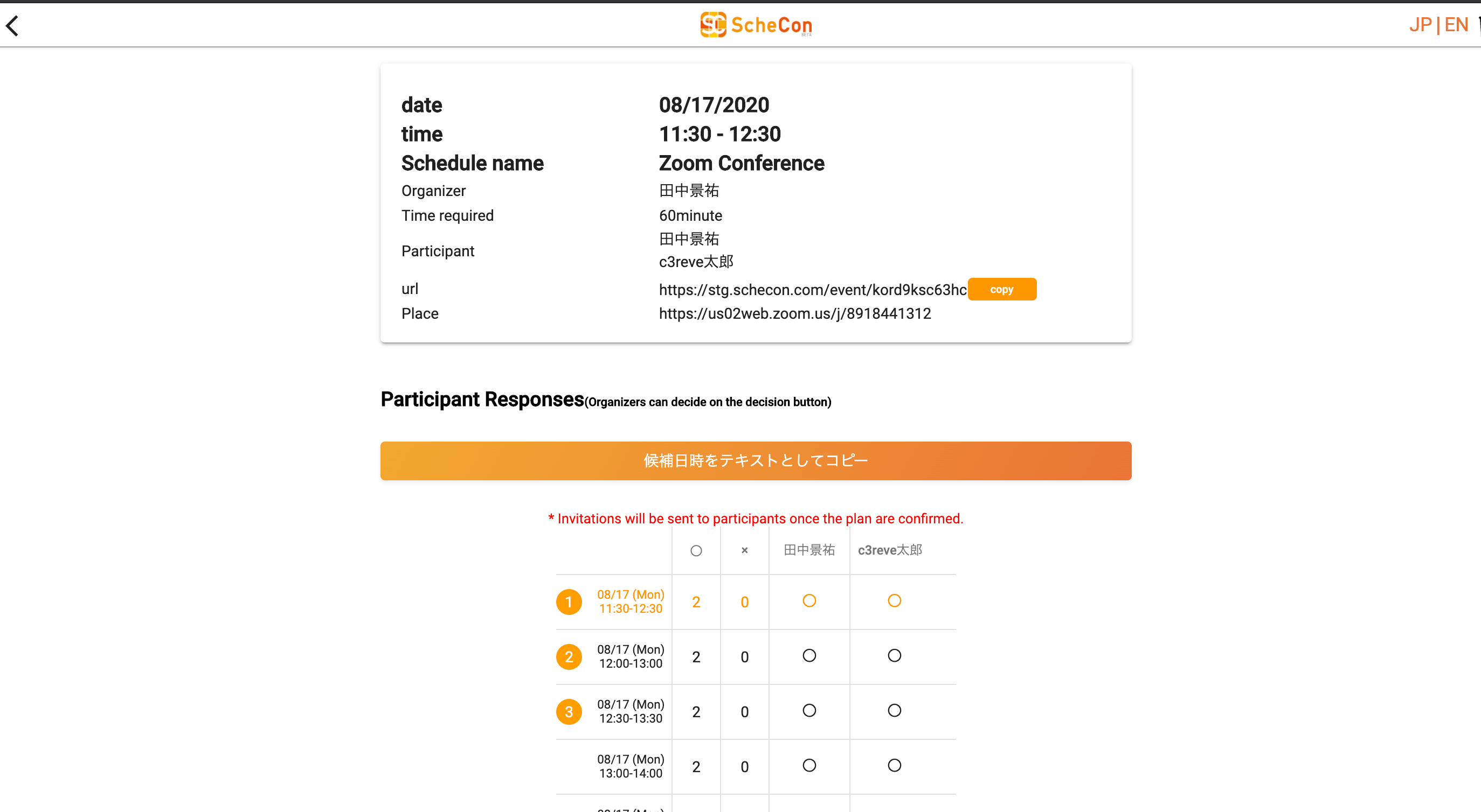 You can confirm schedules and Zoom URL at your mail or event-page (https://schecon.com/en/event/xxxxxxxx).